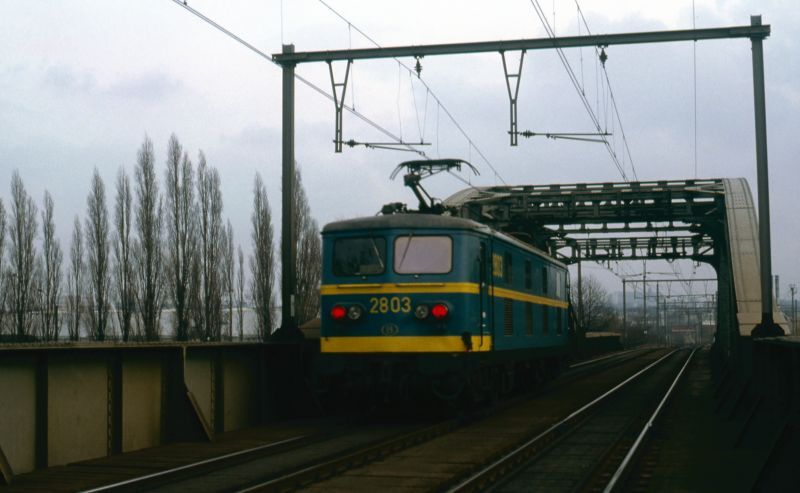 We zien elektrische locomotief 2803 (reeks 28) tijdens een losse rit. De locomotief rijdt net over de Vierendeelbrug van het zeekanaal Brussel – Schelde gereden. De locomotief is blauw geschilderd met gele zichtbaarheidsstrepen. Schenking van Myriam Hendrickx.