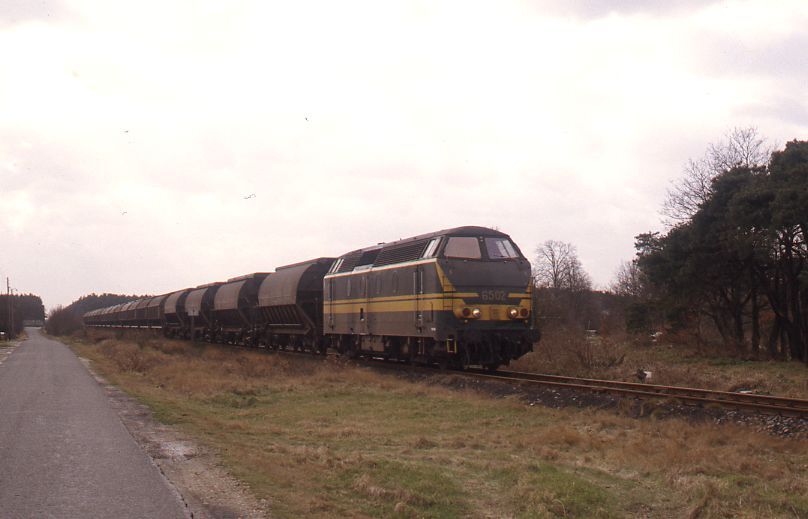 TitelDiesellocomotief 6502 met een goederentrein in Eksel