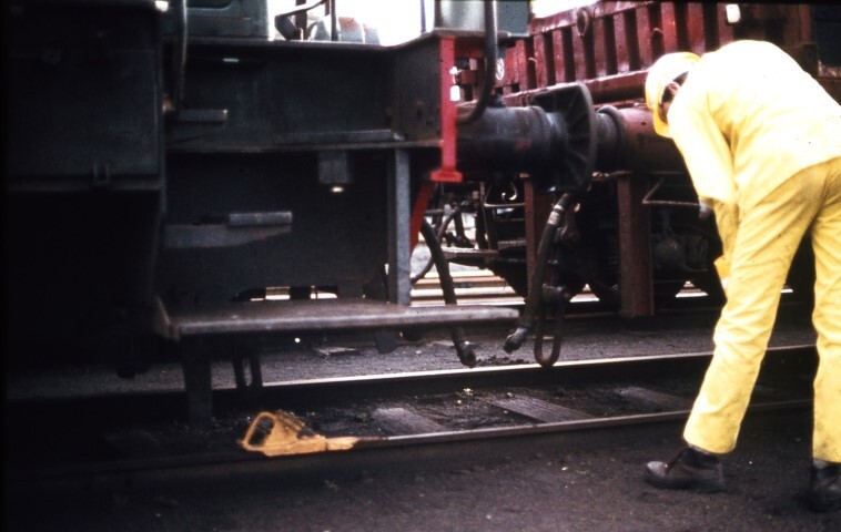 Op deze foto zien we een stopblok die gebruikt wordt om een niet geremde wagen (losse remblokken) vast te zetten om te vermijden dat hij spontaan aan het rollen gaat. Links zien we een locomotief (vermoedelijk reeks 80) en een rangeerder die een trein losgekoppeld heeft van de locomotief. Hij draagt een geel werkpak, een helm, handschoenen en veiligheidsschoenen.