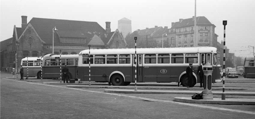 Deze fotogroep bevat vier negatieven. Ze tonen het autobusstation voor het station Gent-Sint-Pieters. We bemerken een aantal bussen die behoren tot verschillende vervoersmaatschappijen, waaronder NMBS. De autobussen van NMBS hadden een groene en beige kleur en droegen op de zijwand het logo. Er staan ook autobussen van NMVB (Nationale Maatschappij der Buurtspoorwegen). Deze hadden een beige/rode kleur. De perrons zijn met haltenummers en bestemmingsborden uitgerust.