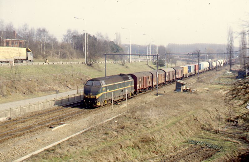 Diesellocomotief 6317 sleept een gemengde goederentrein voorbij Diest. De sleep bestaat uit gesloten wagens, ketelwagens en platte wagens met rongen die geladen zijn met containers.