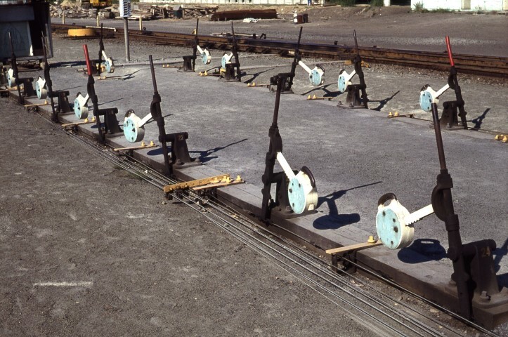Deze foto toont handels voor de manuele bediening van wissels. Deze zijn gemonteerd op houten balken waaraan de draadgeleidingen bevestigd zijn. Deze draadgeleidingen worden naar de wisselnaalden gevoerd om ze te kunnen verleggen. De bollen aan de handels dienen als tegengewicht om de wisselnaalden zonder al te veel kracht te kunnen verleggen. We zien dat over sommige handels een rode hoes is geschoven. Vermoedelijk geven deze toegang naar bezette sporen en mogen ze dus niet behandeld worden of waarschuwen ze het personeel voor een wissel die buiten dienst is.
