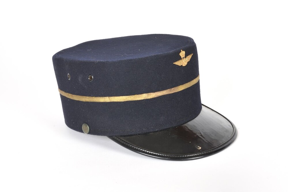 Zwarte kepie met een zwarte klep in kunststof. De stormband ontbreekt, maar aan de zijkanten zijn wel nog twee metalen knopen. Er loop een goudkleurige bies op 4 cm boven de rand. Aan de voorkant werd een spoorweginsigne bevestigd. De kepie is verstevigd met een leren band en de voering is beige.