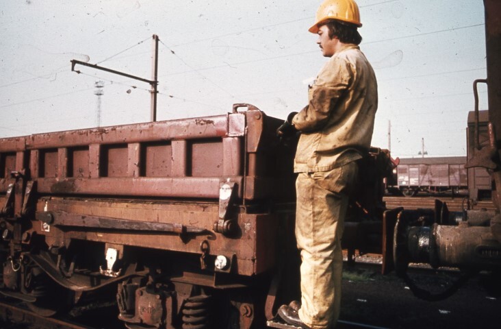 Deze foto toont een platte wagen op draaistellen met rongen en beweegbare schotten. Op de voettrede achteraan de wagen staat een rangeerder tijdens de uitvoering van zijn job. Hij draagt een helm, een geel werkpak, handschoenen en veiligheidsschoenen. De foto werd genomen in het vormingsstation Monceau-sur-Sambre.