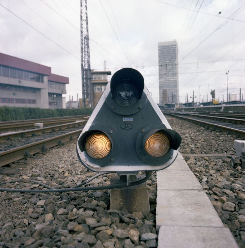 Deze fotogroep bestaat uit drie negatieven. De foto's tonen een grondsein met twee standen. Wit horizontaal betekent stoppen. Bij een schuine stand van de lampen mag de machinist doorrijden. Links zien we de oude en nieuwe seinpost van Brussel-Zuid. In de achtergrond bevindt zich de Zuidertoren.