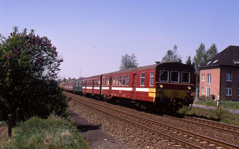 Een reizigerstrein bestaande uit groene en bordeaux M 2-rijtuigen rijdt voorbij Geel. De trein wordt bestuurd vanuit de stuurpost in het M 2-rijtuig vooraan en geduwd door een diesellocomotief reeks 63.