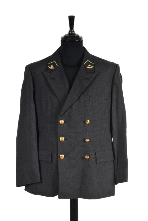 Deze grijze jas heeft een dubbele rij goudkleurige knopen, twee steekzakken, een borstzakje en spoorweginsignes op de revers: een groen/gele keper en een gouden gekroond en gevleugeld wiel. Ook de knopen zijn versierd met een afbeelding van het gevleugeld en gekroond wiel. De jas is gevoerd. Schenking van Clotilde Hayertz.