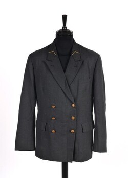BeschrijvingDeze grijze jas heeft een dubbele rij goudkleurige knopen, twee steekzakken, een borstzakje en spoorweginsignes op de revers: een groen/gele keper. De knopen zijn versierd met een afbeelding van het gevleugeld en gekroond wiel. De jas is gevoerd.