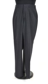 BeschrijvingDeze donkergrijze broek heeft twee steekzakken en wordt vooraan gesloten met een rits en een metalen sluiting. Achteraan zijn twee zakken, afgesloten met een knoop waarop 'Thalys' en het logo staan.