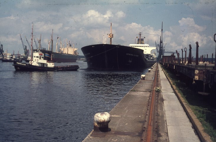 Deze foto toont het Sifferdok met een aantal boten. Rechts staat een sleep platte wagens met rongen op het dok. Het sifferdok is een dok in de haven van Gent, op de rechteroever van het Kanaal Gent-Terneuzen. Het is 2.400 meter lang, 300 meter breed en 13,5 meter diep.