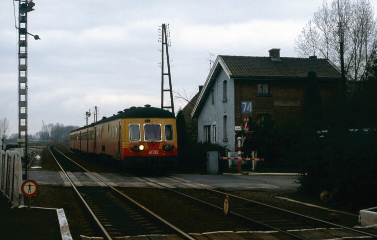 Deze fotogroep bevat drie dia's. Motorwagen 4002 rijdt bij aankomst in station Ename voorbij een bewaakte overweg, en staat dan aan het perron. De sporen zijn er nog beveiligd met mechanische seinen. Op de perrons staan elektrische verlichtingspalen en een stationsnaambord. Vlak bij de bewaakte overweg is nog net een gedeelte van een voetgangerspad tussen de sporen zichtbaar dat enkel mag gebruikt worden door bevoegd spoorwegpersoneel. Ename ligt langs spoorlijn 89 (Denderleeuw - Oudenaarde - Kortrijk). Schenking van Myriam Hendrickx.