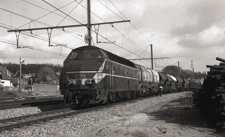 Deze locomotief behoort tot de reeks 62. Ze heeft een gemengde goederentrein aan de haak. De trein bevindt zich op een wijkspoor en wacht vermoedelijk op een doorrit van een reizigerstrein. Rechts zien we afgedankte dwarsliggers die naast het spoor liggen. Schenking van Myriam Hendrickx.