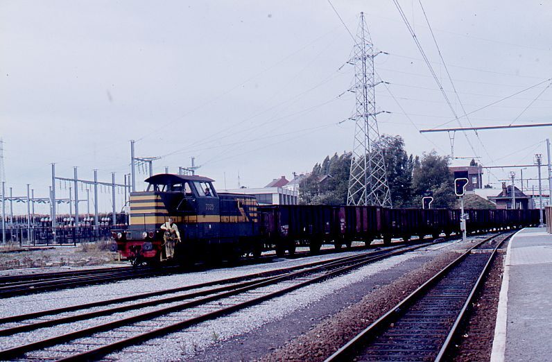 Diesellocomotief 7325 (reeks 73) is onderweg met een goederentrein samengesteld uit open bakwagens. Op de voettrede vooraan de locomotief staat een rangeerder. Rechts zien we het perron en op de achtergrond enkele lichtseinen. Schenking van Myriam Hendrickx.