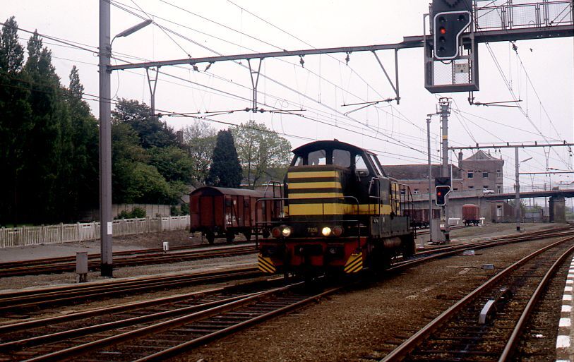 Deze fotogroep bevat drie dia's. We zien diesellocomotief 7356 (reeks 73) in het station tijdens een rangeerbeweging en met een goederentrein bestaande uit platte wagens met rongen. De locomotief is groen geschilderd met gele zichtbaarheidsstrepen. Op de andere sporen staan ook een gesloten wagen, een open stortwagen, een pakwagen en een tremelwagen. Boven de sporen hangt een seinbrug met lichtseinen. In de achtergrond zien we een elektrisch onderstation. Schenking van Myriam Hendrickx.