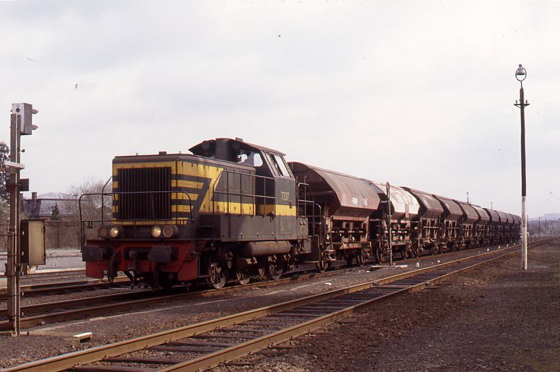 Deze fotogroep bevat twee dia's. Diesellocomotief 7337 (reeks 73) sleept een lange goederentrein met stortwagens. De trein staat te wachten voor een stopsein. Rechts staat een houten verlichtingspaal.