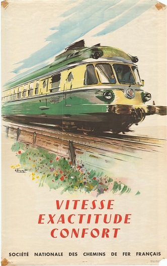 Deze affiche van de Franse spoorwegen (SNCF) wil de voordelen van reizen met de trein in de verf zetten. Ze toont een gekleurde afbeelding van een groen/beige motorwagen. De lichte penseelstreken impliceren snelheid. Schenking van de Koninklijke Belgische Vereniging der Vrienden van het Spoor (KBVVS).