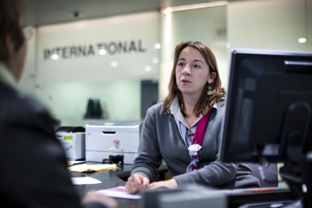 BeschrijvingDeze groep bevat 12 digitale foto’s. Ze tonen een loketbediende in het station Luik-Guillemins. Ze draagt als uniform een grijs gilet en een grijs/roze sjaal. Een metalen broche in de vorm van het NMBS-logo is op haar sjaaltje gespeld.
