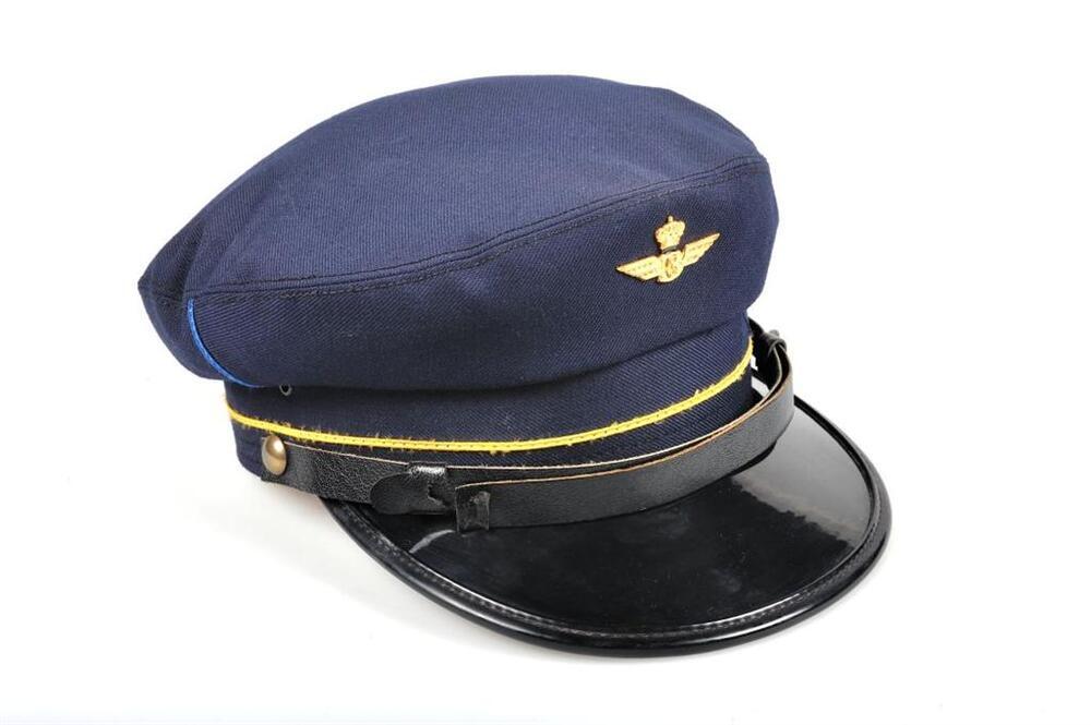 Donkerblauwe dienstpet met een zwarte klep in kunststof. De leren stormband is vastgemaakt met twee metalen knopen. Er loopt een gele bies op 2 cm boven de rand. Aan beide zijkanten loopt een enkele blauwe verticale streep. Vooraan is een spoorweginsigne bevestigd. De pet is verstevigd met een beige leren band en de voering is zwart.