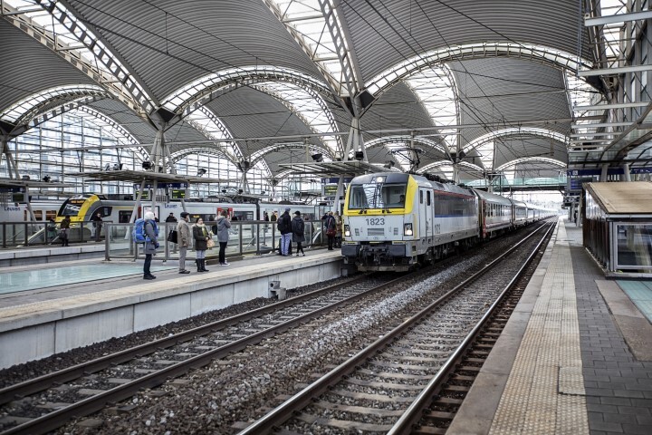 Deze fotogroep bevat zes digitale foto's. Ze tonen verschillende reizigerstreinen aan de perrons in station Leuven. We zien o.a. elektrische locomotief 1823 met I 10-rijtuigen,een Desiro-motorstel, M 6-dubbeldekrijtuigen en elektrische locomotief 1835. Op de overdekte perrons staan reizigers te wachten. De foto's werden genomen bij het vallen van de avond.