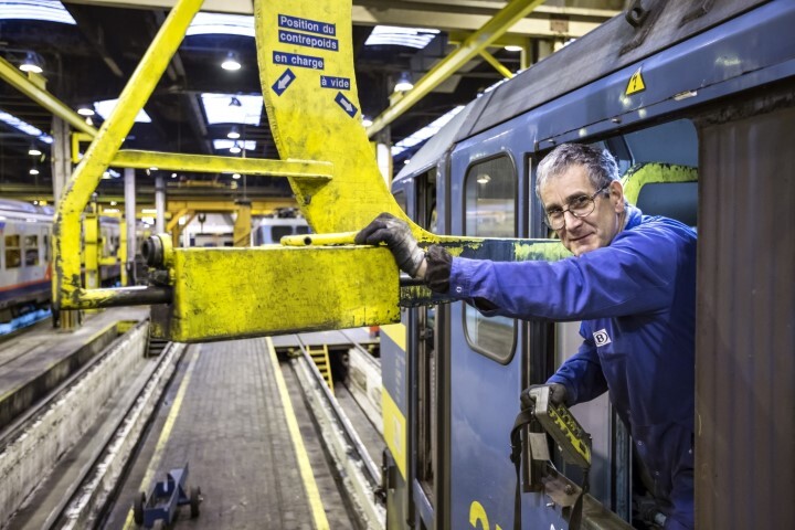 Deze fotogroep bevat drie digitale foto’s. Ze tonen een technicus-mecanicien aan het werk in de tractiewerkplaats Kinkempois. Hij bedient vermoedelijk een heftoestel om de elektrische uitrusting van een locomotief reeks 27 aan een grondig onderzoek te onderwerpen. Hij draagt een blauw werkpak en veiligheidshandschoenen.