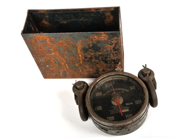 Deze dynamometer werd uitgevonden door dhr. Dillon. Het werd gebruikt om spanningen en gewichten te meten, zoals bijvoorbeeld de spanning van kabels. Deze dynamometer heeft een zwarte wijzerplaat die tot 3500 gaat en twee wijzers; een blauwe en een rode. De wijzerplaat is met een kunststoffen plaatje afgedekt. De dynamometer bevindt zich in een doos zonder deksel.