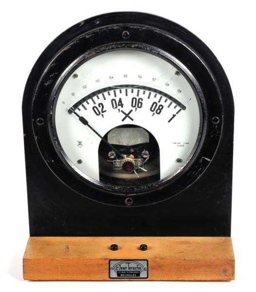 De ampère- en voltmeter zijn instrumenten om elektrische stroom te meten. Deze meter werd waarschijnlijk in een labo van de NMBS gebruikt. Het meetinstrument heeft een zwart frame en is in een houten plank gemonteerd. Achter een rond plastic scherm bevindt zich een witte wijzerplaat met een meetschaal die van 0 tot 1 gaat. Vooraan bevinden zich twee stekkeringangen, aan de achterkant zijn er tien.