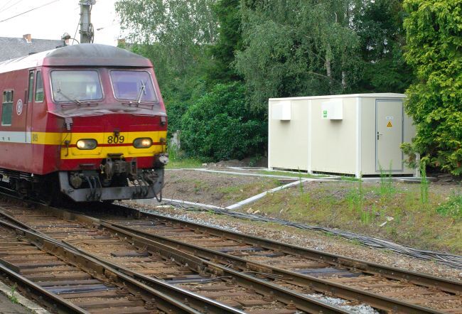 BeschrijvingDeze groep bestaat uit twee digitale foto's. Ze tonen een seinkast langs een spoor. We zien ook de vierledige motorwagen 809. Het treinstel is bordeaux geschilderd met gele en witte banden.