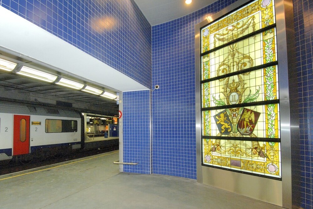 Deze groep bestaat uit drie digitale foto’s. Ze tonen het glasraam dat zich bevindt op perron 1 in station Brussel-Luxemburg. We zien ook een deel van het perron en een drieledig motorstel 96 op het andere spoor. Het glasraam is vermoedelijk afkomstig uit het vroegere bovengrondse stationsgebouw dat tot het ontvangstcentrum van het Europees Parlement werd verbouwd.
