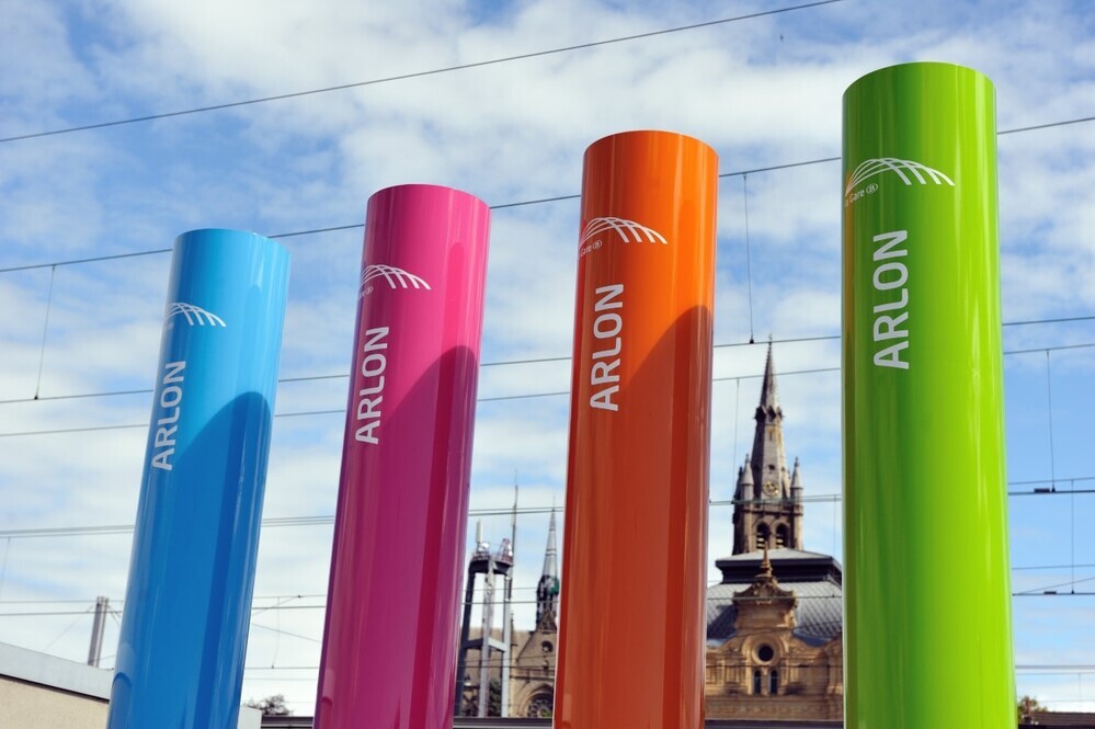 BeschrijvingDeze groep bevat vijf digitale foto's. Ze tonen de vier gekleurde totems van NMBS-Holding aan het station Aarlen.