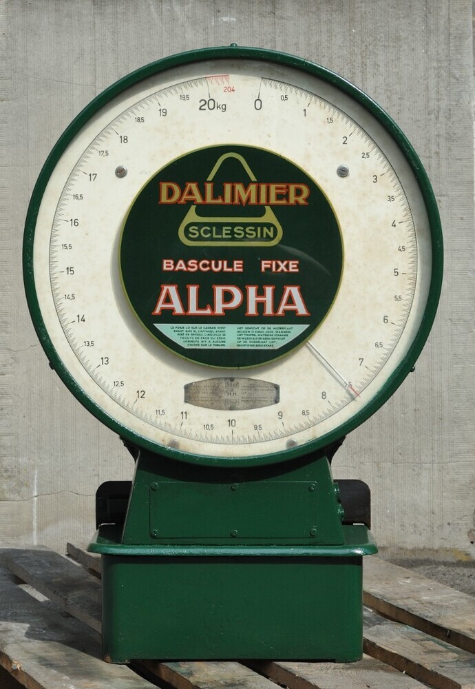Groene weegschaal Alpha met een wijzerplaat die tot 20 kilogram gaat. Deze weegschaal werd gebruikt voor het wegen van pakjes in de stations. Ze heeft langs twee kanten een wijzerplaat, beschermd door een doorzichtige kunststoffen plaat.