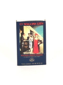 BeschrijvingOp de voorzijde van dit donkerblauwe luciferdoosje staat een reproductie van een affiche van de 'Cie Wagons Lits Pullman Orient Express'.
