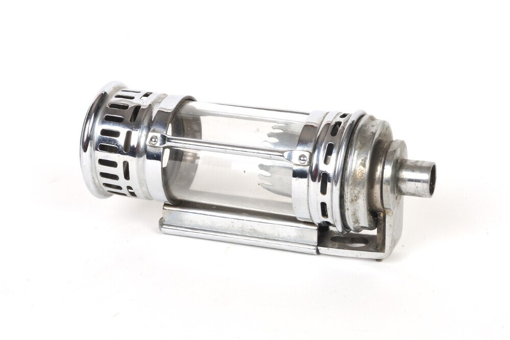 BeschrijvingDit petroleumlampje uit metaal en glas werd aan de muur van een rijtuig gehangen. Het diende vermoedelijk als leeslampje in een slaaprijtuig.