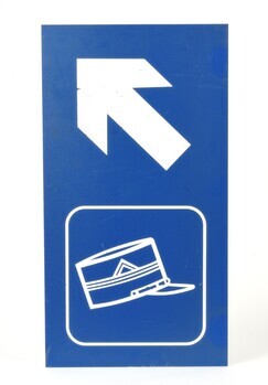 BeschrijvingOp dit blauwe bord staat in wit een afbeelding van een kepie van een stationschef met daarboven een pijl. Het pictogram werd opgehangen in een station en gaf de weg aan naar het kantoor van de stationschef.