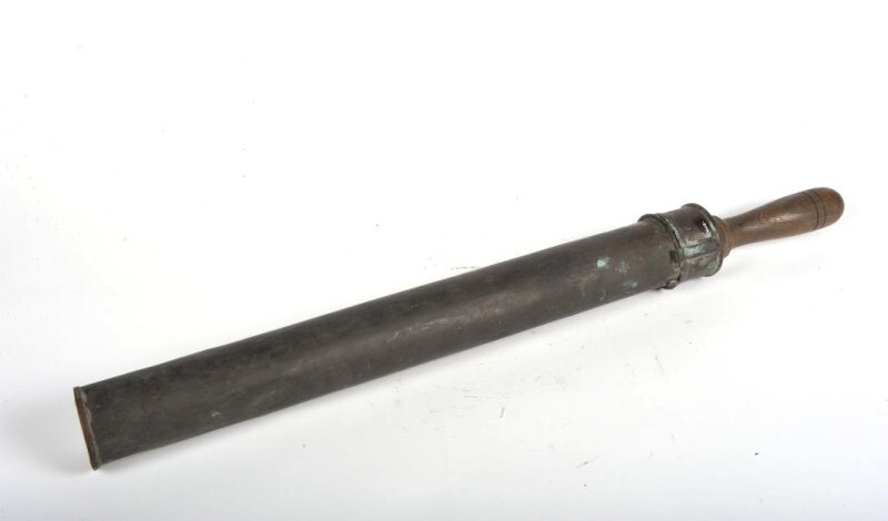 BeschrijvingDeze cillindervormige smeerkan uit koper heeft een reservoir met geperforeerde kleine gaatjes aan het uiteinde. Aan de andere kant van het reservoir bevindt zich een beweegbare houten steel.