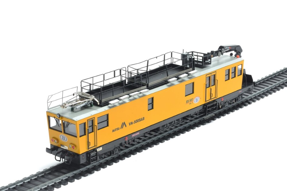 Schaalmodel van de VM 500SAB. Deze motorwagens worden gebruikt door de dienst ES (Elektriciteit en Seininrichting). Op het dak bevindt zich een platform met zwarte veiligheidsreling. Achteraan bevindt zich een hoogwerker. Op de zijkanten van deze gele motorwagen staan verschillende opschriften zoals 'Matisa VM-500SAB', 'ES 507 Dis. C' en het logo van de NMBS. De maquette is gemaakt op schaal H0 1/87.