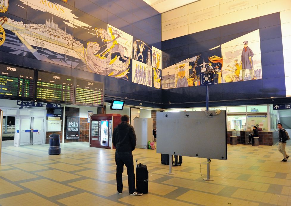 Deze groep bestaat uit 11 digitale foto’s. Ze tonen binnenzichten van de wachtzone en de loketten van het station Bergen. Tegen de wand hangen een treinaankondiger en een muurschildering met afbeeldingen van de Car d’Or en het Lumeçon-gevecht tussen Sint-Joris en de draak. Daarna zien we de sluiting van het station voordat de werken aan het nieuwe station van start gaan.