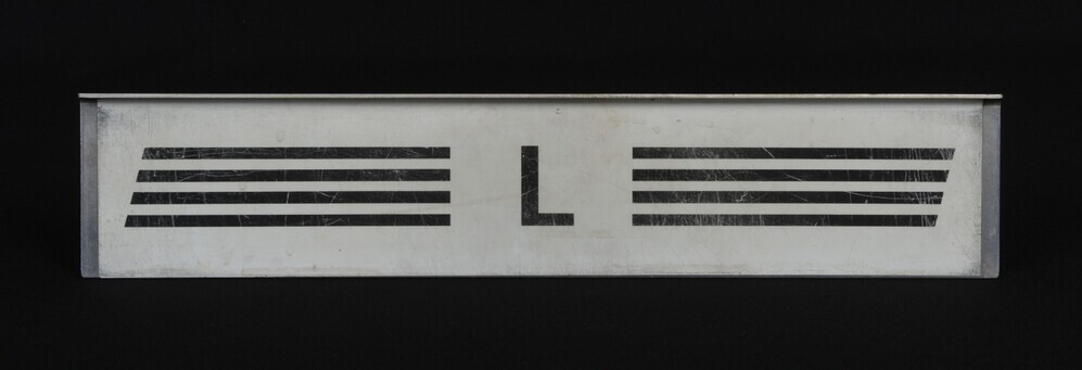Aluminium bord met zwarte letters. Het opschrift wordt aan beide zijden geflankeerd door vier zwarte strepen. Dit bord werd aan een treinaankondiger gehangen om L-treinen aan te kondigen. Een lokale trein is een passagierstrein die tijdens zijn traject normaal gesproken in alle stations stopt.