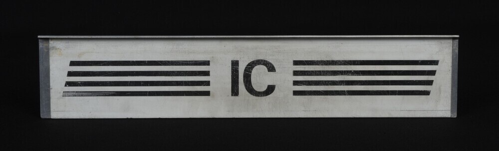 Aluminium bord met zwarte letters. Het opschrift wordt aan beide zijden geflankeerd door vier zwarte strepen. Dit bord werd aan een treinaankondiger gehangen om IC-treinen aan te kondigen. Een InterCity is een reizigerstrein die een snelle verbinding vormt tussen verschillende steden en in principe slechts in de grotere en/of belangrijkste stations stopt.