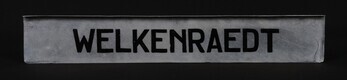 BeschrijvingAluminium bordje met zwarte letters. Het bord werd aan een treinaankondiger gehangen om treinen richting Welkenraedt aan te kondigen.