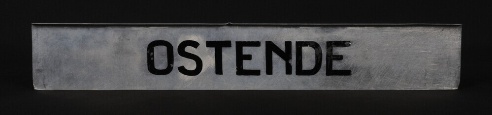 BeschrijvingAluminium bordje met zwarte letters. Het bord werd aan een treinaankondiger gehangen om treinen richting Oostende aan te kondigen.