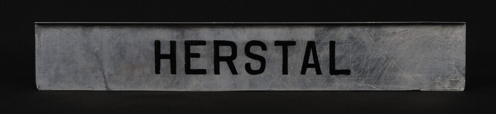 BeschrijvingAluminium bordje met zwarte letters. Het bord werd aan een treinaankondiger gehangen om treinen richting Herstal aan te kondigen.