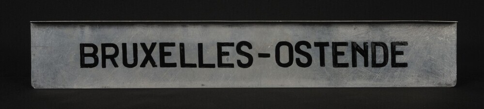 BeschrijvingAluminium bordje met zwarte letters. Het bord werd aan een treinaankondiger gehangen om treinen richting Brussel en Oostende aan te kondigen.