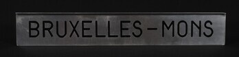 BeschrijvingAluminium bordje met zwarte letters. Het bord werd aan een treinaankondiger gehangen om treinen richting Brussel en Bergen aan te kondigen.