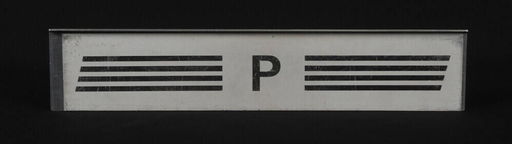 BeschrijvingAluminium bord met zwarte letters. Het opschrift wordt aan beide zijden geflankeerd door vier zwarte strepen. Dit bord werd aan een treinaankondiger gehangen om P-treinen aan te kondigen. Piekuurtreinen zijn treinen die op drukke momenten het reguliere aanbod aanvullen.