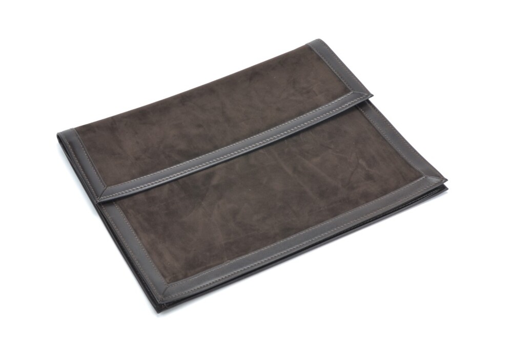 Deze bruine aktetas heeft één groot vak en vooraan een vak afgesloten met rits. Aan de binnenzijde van de flap staat linksboven een logo en rechts de namen 'ABC ABT ACEC ARBED-MMRA BN BREC CMI TRANSURB'. Dit zijn allemaal namen van constructeurs van rollend materieel. Deze tas werd vermoedelijk uitgedeeld op een congres.