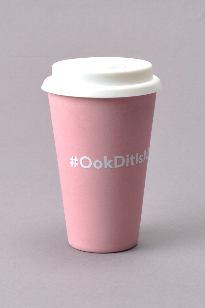 BeschrijvingDe roze drinkbeker heeft een witte plastic afsluitdop. Op de zijkant staat in witte letters het opschrift: '#OokDitIsMijnTrein'.
