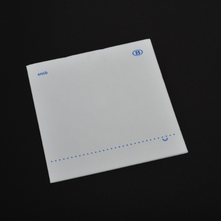 BeschrijvingWit servet met blauwe opdruk: links bovenaan 'sncb', rechts bovenaan het logo van NMBS en onderaan een stippellijn met smiley.