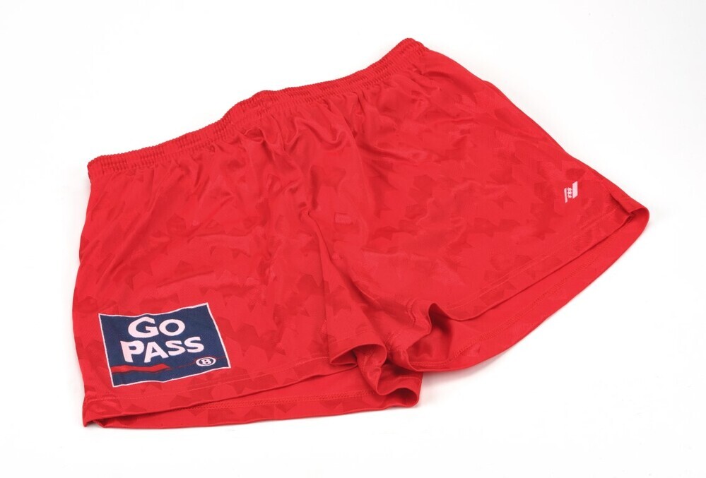 BeschrijvingRood glanzend voetbalshortje met links het logo van Rucanor en rechts het logo van ‘Go Pass’ en NMBS.