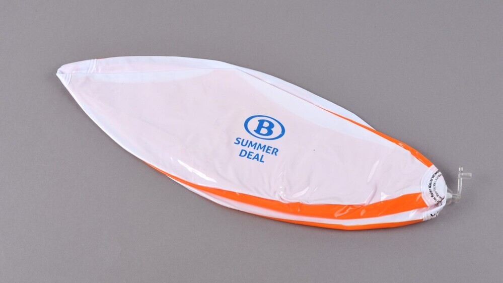 BeschrijvingOpblaasbare strandbal met doorzichtig plastic ventiel. De bal heeft zes panden (breedte 13.3 cm) afwisselend in wit en oranje. Op een wit pand staat het logo van NMBS en ‘Summer deal’ in blauw.