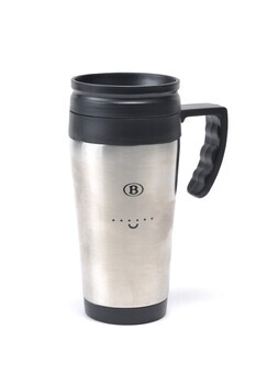BeschrijvingMetaalkleurige drinkbeker met zwart handvat en afneembare sluitdop. Op de beker staat langs beide zijden in zwart het NMBS-logo en een stippellijn met smiley. De sluitdop heeft een opstaande rand en een verschuifbare clip om te drinken.